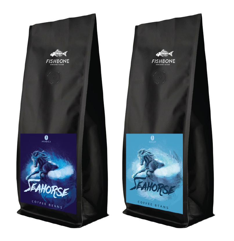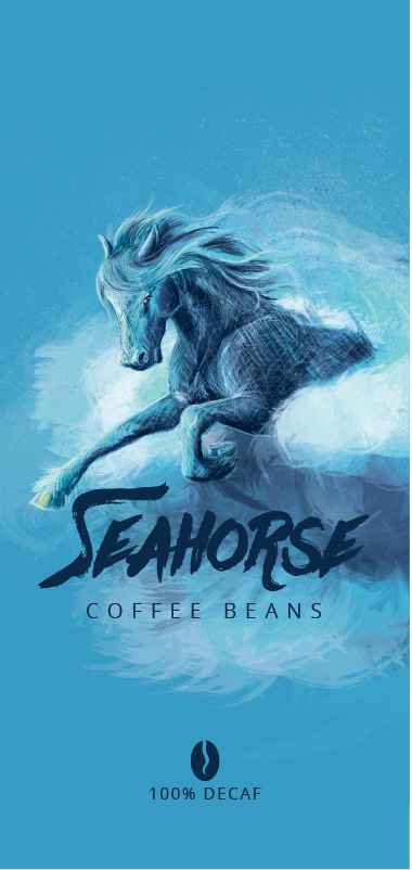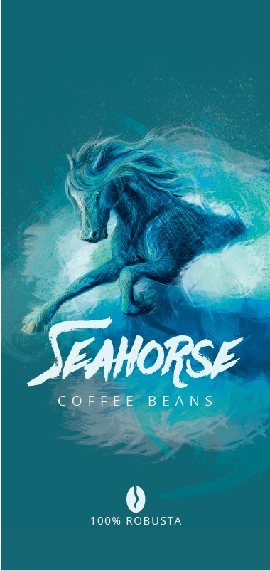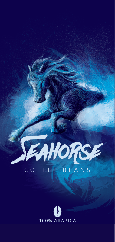BRIEF: Design a brand "Seahorse" to sell coffee bean bags at Fishbone Wines, continuing with the 'sea' theme of Fishbone. Client preference to use horse imagery instead of seahorse / sea dragons.