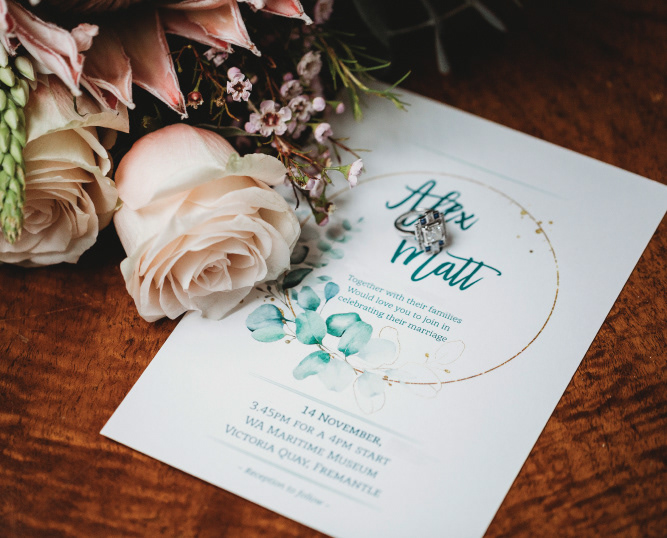 Brief: Design all the print items for a wedding. Clean design with a eucalyptus theme and colours. Save the date, invites, seating plan poster and menus required.